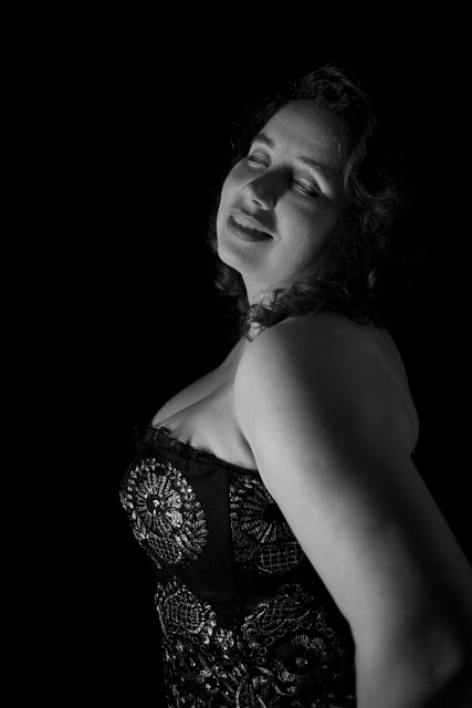 Descrição da foto #PraCegoVer Imagem vertical. Sob uma luz tênue, Ewelin Canizares está em pé, de perfil e, mostrada da cintura para cima, tem os olhos fechados e sorri com prazer. É uma jovem de pele clara. Os cabelos cacheados estão soltos sobre os ombros. Tem sobrancelhas grossas e levemente arqueadas. Os lábios grossos estão entreabertos num sorriso. Veste um corpete tomara que caia preto com bordados circulares e brilho. Seu rosto está levemente inclinado para a esquerda e os olhos estão fechados.